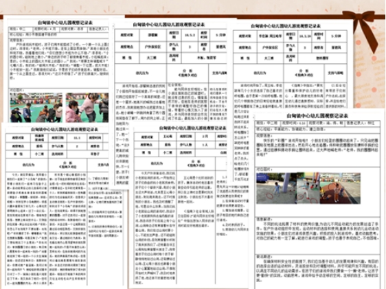 同时,教师还注重做循环式户外活动中的观察者,根据观察目的,选取合适的观察角度,采取多手段、多方法观察幼儿,以获取有价值的信息去分析问题、解决问题。观察个别幼儿运动情况,从幼儿情绪状态、运动能力、安全意识、材料提供、心理品质等方面去观察、关注、分析,以便签、视频、图表等多种方式结合,形成循环式户外活动幼儿个案观察记录案例集册。