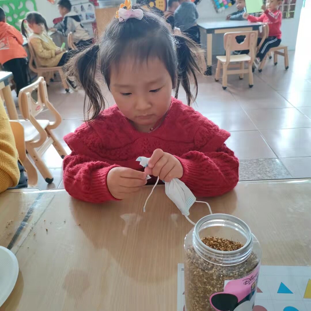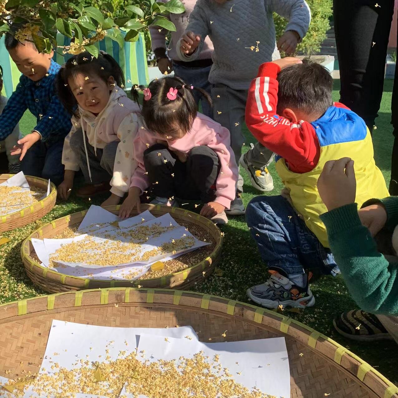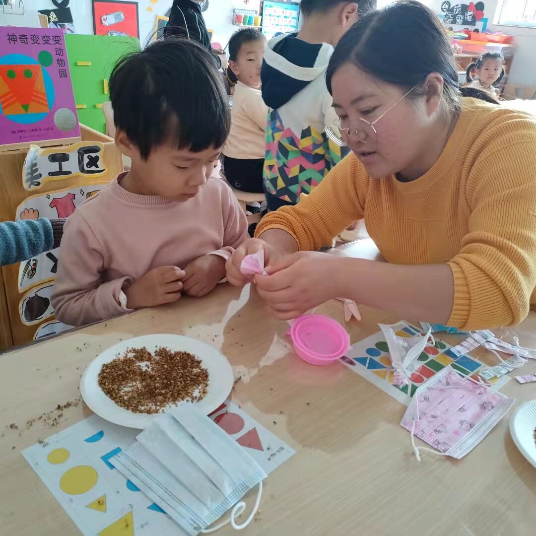 孩子们用自己收集到的桂花,准备制作精美的桂花香包。
