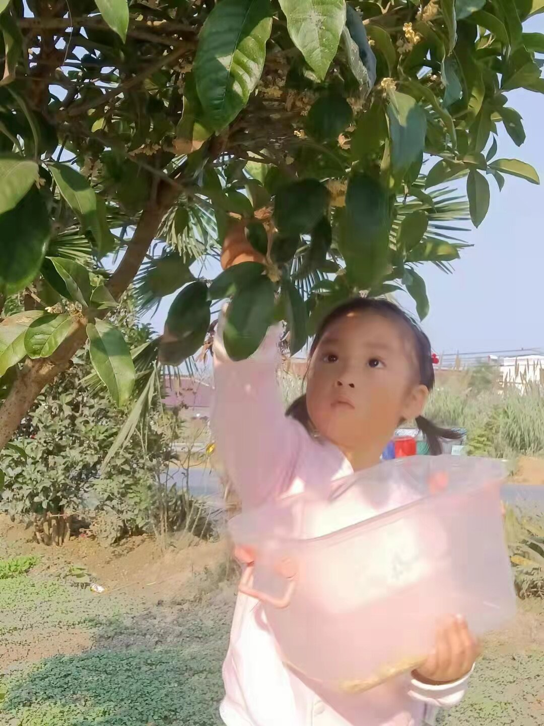 孩子们好奇地围着桂花树,有些蹲下来,小心翼翼地拾起飘落的桂花仔细观察,生怕把它捏坏了;有的踮起脚尖,伸长小手轻轻触摸着枝丫上的小花苞;有的小脸凑近树枝,用力的嗅着花香。