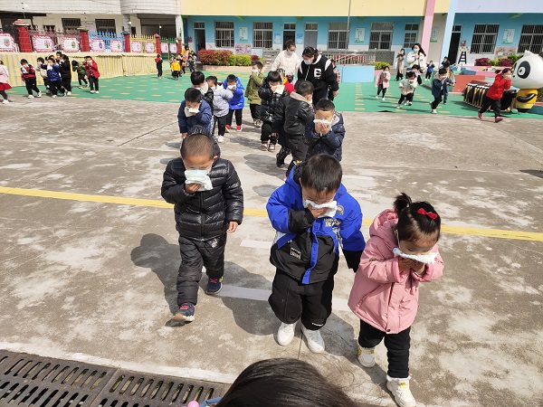 警报拉响后,班级教师快速地给孩子们准备湿毛巾,只见孩子们用湿毛巾捂住口鼻,弯腰小步快走,手扶楼梯,不吵不闹,一个接一个,按照班级的疏散路线紧张且有序地从教室撤离。到达操场安全地带后,各班老师及时清点人数,进行汇报,确保全体师幼安全撤离。