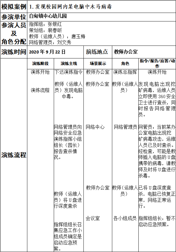 演练中,教师正在插入U盘查找资料,忽然电脑出现卡顿,光标肆意晃动现象。教师立即使用病毒查杀软件对U盘进行查杀,查杀后拔出U盘,同时报告网络管理员。网络管理员立即对电脑进行断网处理和深度杀毒,并完成数据备份,同时向网络安全应急演练指挥小组组长(园长)报告查杀情况。30分钟后,网络安全威胁解除,电脑恢复正常运营。演练结束后,网络安全应急小组对此次演练进行了记录和总结评价。