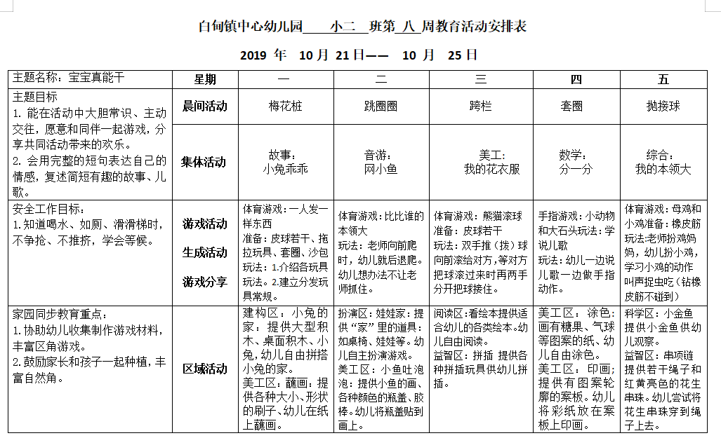 小二班第八周教育活动安排表